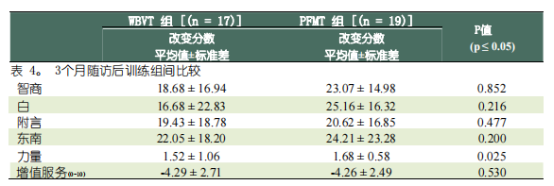 為了評(píng)估客觀(guān)測(cè)試的測(cè)試者內(nèi)部可靠性,在一項(xiàng)試點(diǎn)研究中,十名女性每隔7天重復(fù)測(cè)量。使用Kendall考試評(píng)估改良牛津分級(jí)系統(tǒng)對(duì)盆底肌肉力量的重測(cè)信度(p≤0.0001)。第一和第二骨盆底肌肉力量之間的相關(guān)性為r=0.857和p值=0.003。結(jié)果WBVT組和PFMT組之間的人口統(tǒng)計(jì)學(xué)變量沒(méi)有顯著差異,表明組匹配良好。PFMT組絕經(jīng)后婦女比例為82%,WBVT組為88%。在訓(xùn)練的第二周和第三周,三個(gè)受試者退出(圖1)。所有剩余的患者都完成了四個(gè)星期的培訓(xùn)和評(píng)估課程。在兩組中,受試者都非常迅速地熟悉了訓(xùn)練方案。兩組均無(wú)副作用、不滿(mǎn)意或不適的報(bào)告。WBVT組的所有受試者,關(guān)于他們的經(jīng)歷進(jìn)展率=預(yù)測(cè)試平均×100接受治療,表示振動(dòng)訓(xùn)練很有趣,但很累。獨(dú)立樣本t檢驗(yàn)顯示,在研究開(kāi)始時(shí),兩組之間沒(méi)有顯著差異(p≤0.05),但WBVT組和PFMT組(表2)的所有變量在前測(cè)和后測(cè)之間存在顯著差異(p≤0.05)。兩組之間所有數(shù)據(jù)的變化分?jǐn)?shù)沒(méi)有顯著差異(表3)。PFMT(n=19)和WBVT(n=17)的36名受試者之間所有數(shù)據(jù)的變化分?jǐn)?shù)無(wú)統(tǒng)計(jì)學(xué)差異后3個(gè)月隨訪(fǎng),這意味著兩種方案的治療效果相似(表4)。