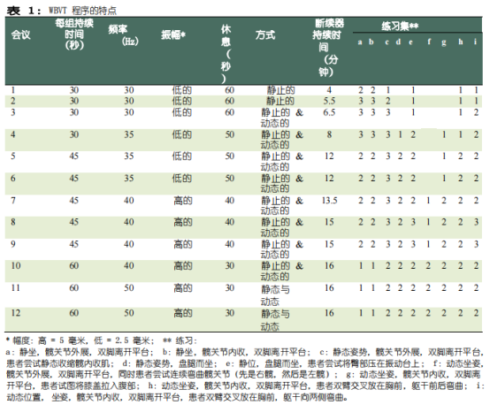 在干預(yù)前評(píng)估后,兩組都開(kāi)始了為期4周的培訓(xùn)計(jì)劃(每周3天)(9、21-25)。WBVT組根據(jù)表1所示的建議方案在振動(dòng)平臺(tái)(Powerplate,USA)上進(jìn)行干預(yù),并且PFMT組被教育在監(jiān)督下逐步進(jìn)行PFMT。PFMT包括與髖內(nèi)收肌、臀肌和腹部肌肉在仰臥位、坐位、站立位、彎臥位、橋接位、小蹲位、蹲位時(shí)的靜態(tài)收縮相關(guān)的PFM靜態(tài)收縮。PMFT組被教育以3-4組的方式進(jìn)行每個(gè)練習(xí),重復(fù)15-20次,組間暫停60秒。在3個(gè)月的隨訪(fǎng)期間,參與者每月參加一次一小時(shí)的運(yùn)動(dòng)課。兩組患者在最后一次會(huì)議上都學(xué)習(xí)了以家庭為基礎(chǔ)的PFMT計(jì)劃。他們被鼓勵(lì)每天至少進(jìn)行一次以家庭為基礎(chǔ)的活動(dòng)。為了在隨訪(fǎng)期間準(zhǔn)確監(jiān)測(cè)PFMT,向受試者分發(fā)了說(shuō)明PFM加強(qiáng)練習(xí)的小冊(cè)子和記錄表。受試者被要求記錄每天在家中進(jìn)行的鍛煉時(shí)間和組數(shù)。記錄表每月在課堂上收集和檢查一次。SPSS(版本17,SPSSInc和Chicago,IL)用于進(jìn)行分析。數(shù)據(jù)的正態(tài)分布由一個(gè)樣本Kolmogorov-Smirnov檢驗(yàn)確定,參數(shù)檢驗(yàn)用于分析數(shù)據(jù)。應(yīng)用方差分析來(lái)確定每組的差異。使用獨(dú)立樣本t檢驗(yàn)比較訓(xùn)練開(kāi)始和結(jié)束時(shí)各組之間的基線(xiàn)測(cè)量值,以及