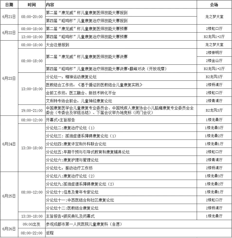 ②分論壇:康復(fù)治療論壇、孤獨癥譜系障礙康復(fù)論壇、醫(yī)教結(jié)合康復(fù)論壇、早期干預(yù)與引導(dǎo)式教育論壇和康復(fù)輔具學(xué)組論壇、康復(fù)評定和外科聯(lián)合論壇、中西醫(yī)結(jié)合和社區(qū)康復(fù)論壇康復(fù)護理與管理論壇、精神運動療法論壇、信息化及青年學(xué)組論壇