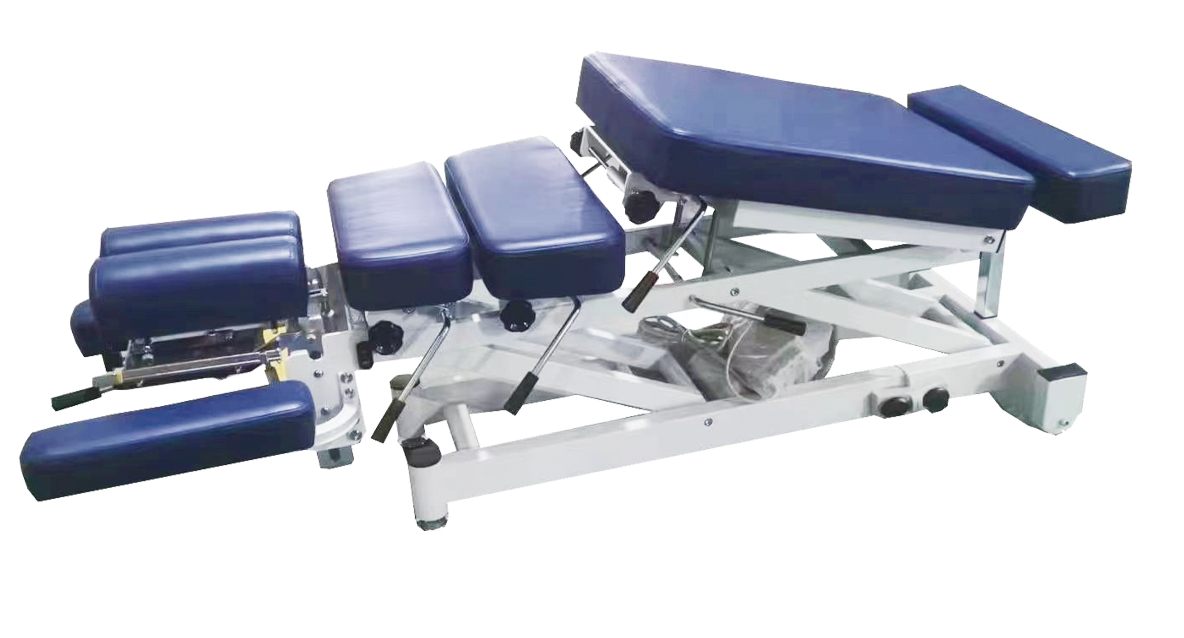 該設(shè)備具有床面高低可調(diào)(調(diào)高用于矯正前的手法按摩脊柱放松和檢查,調(diào)低后更方便發(fā)力,用于脊椎矯正)。這些設(shè)備配置了頭部、頸椎、胸椎、腰椎、骨盆部位頓壓滑落裝置(一種定向、定量、定點力的閃動裝置)。