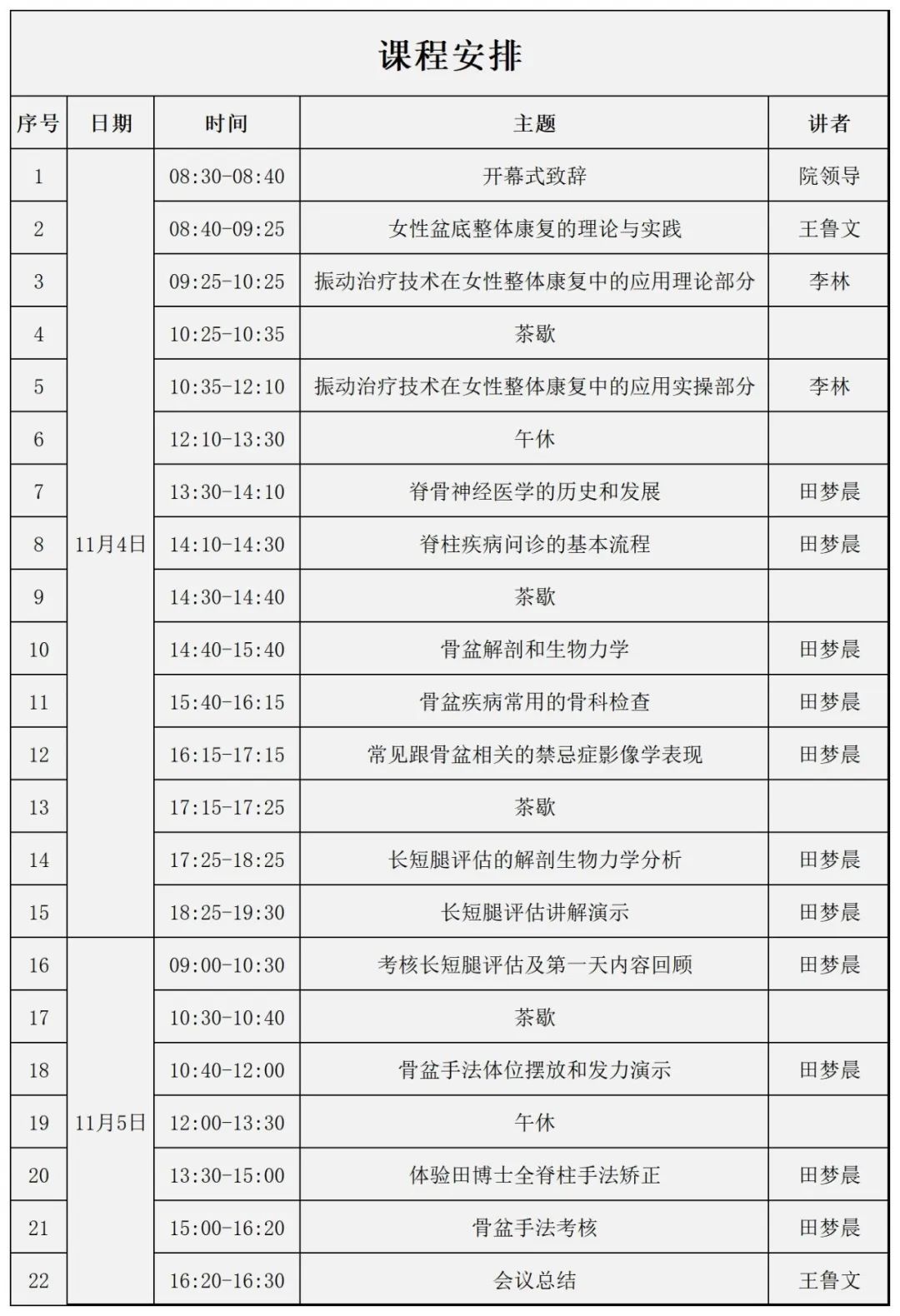 本次培訓(xùn)特邀請鄭州大學(xué)第三附屬醫(yī)院王魯文主任分享女性盆底整體康復(fù)的理論與實踐;李林老師分享振動治療技術(shù)在女性康復(fù)的應(yīng)用理論和實操;田夢晨老師分享骨盆手法。(課程安排詳見附件)