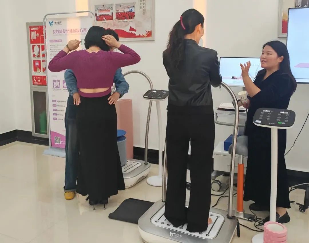 互動體驗環(huán)節(jié),李林老師誠邀現(xiàn)場的老師親自上陣,通過親身體驗來加深對骨盆評估方法的理解。在這一環(huán)節(jié)中,老師們積極參與,氣氛熱烈。隨后,借助羽豐醫(yī)療提供的高三維骨盆矯正治療系統(tǒng),李林老師根據(jù)每位體驗老師的骨盆評估結(jié)果,量身定制了振動治療方案。這一針對性的治療措施實施后,骨盆矯正效果立竿見影,不少老師驚嘆于治療效果之顯著,紛紛表示要進一步了解和嘗試這一先進的治療系統(tǒng)。