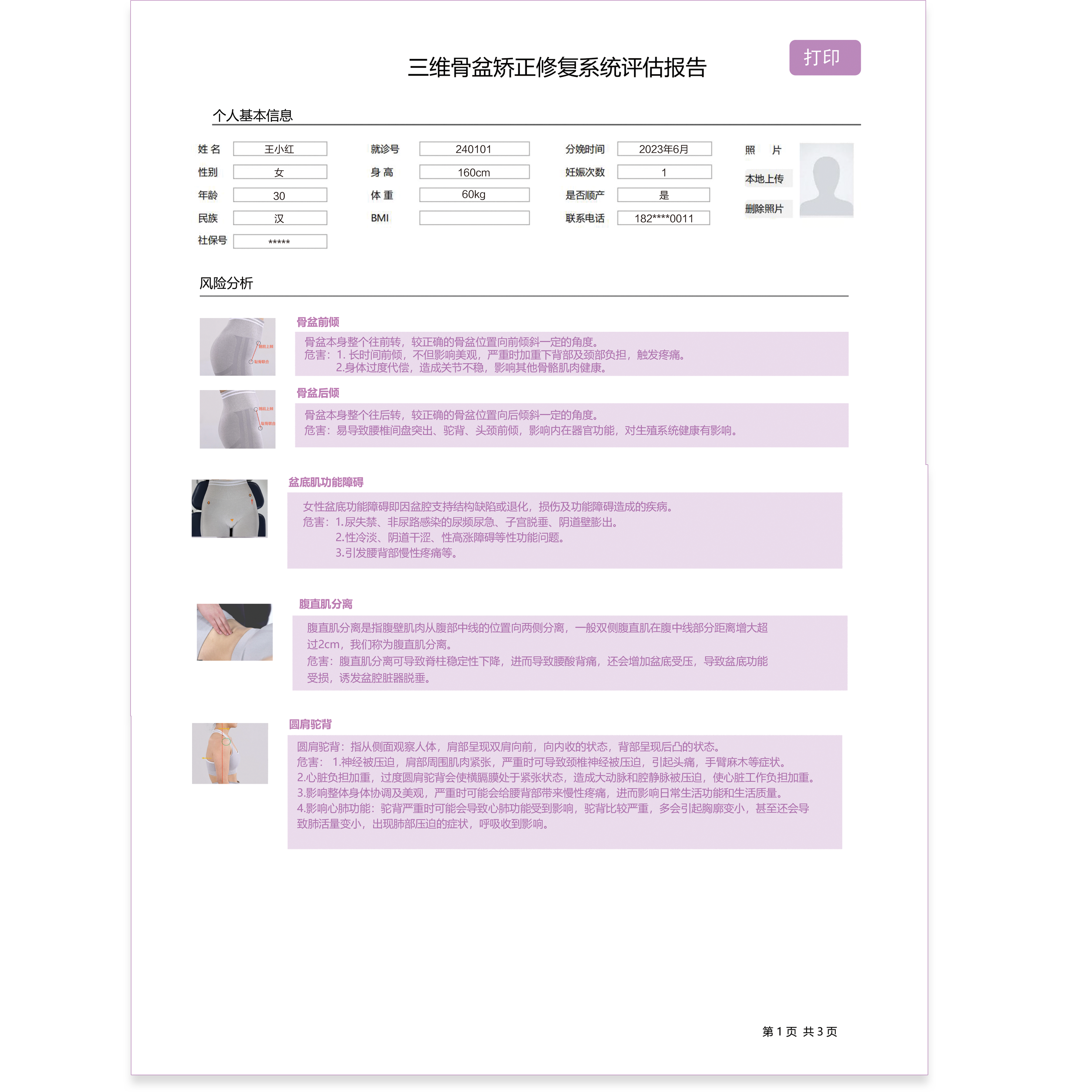 軟件可指導(dǎo)臨床操作人員對用戶進(jìn)行骨盆運(yùn)動功能障礙評估、盆底肌功能障礙評估、腹直肌分離評估、姿勢不良快速評估測試。